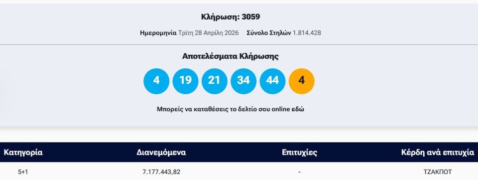 Πραγματοποιήθηκε το βράδυ της Τρίτης (28/4) η κλήρωση 3059 του Τζόκερ που μοιράζει στην πρώτη κατηγορία πάνω από 7,1 εκατ. ευρώ.